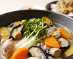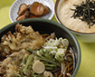 体に優しい野菜がたっぷり! 地元農家の野菜をたっぷり入れ、つゆは牛蒡の香りの味噌仕立てにしました。秋を味覚の茸として、舞茸の天ぷらを乗せたミニ天丼とセットにて販売しております。