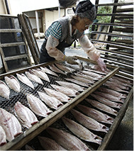 魚の“開き”から“干し”まですべての加工は店舗隣の自社工場で行っています。