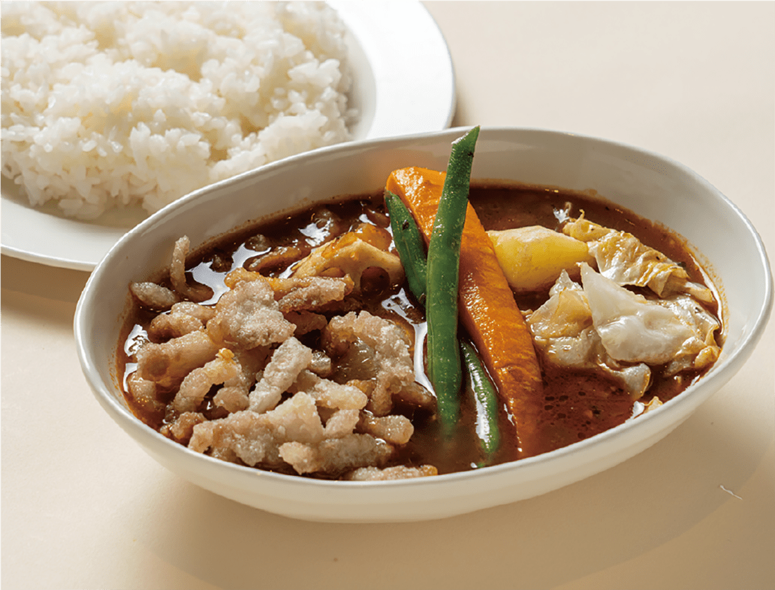 スープカレーに輪厚店人気の笹豚をトッピング。隠し味に笹豚ニンニクラードを使用した、ここだけの逸品。