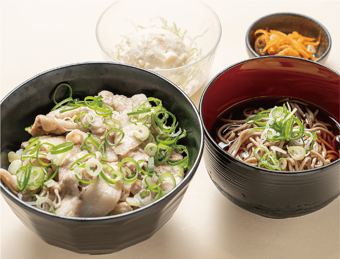 地元伊達市のブランド豚『黄金豚』を塩だれで絡ませたさっぱりとした味わいの一品。半そばの他に、ポテトサラダと帆立の佃煮も付いて大満足のメニューです。