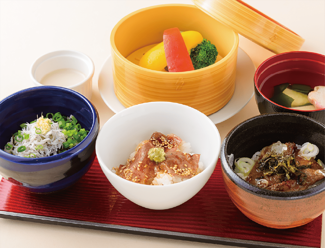 当店で人気のたん塩丼、閖上産のしらす丼、仙台牛の炙り丼。3種類の宮城飯の食べ比べをお楽しみいただけます。