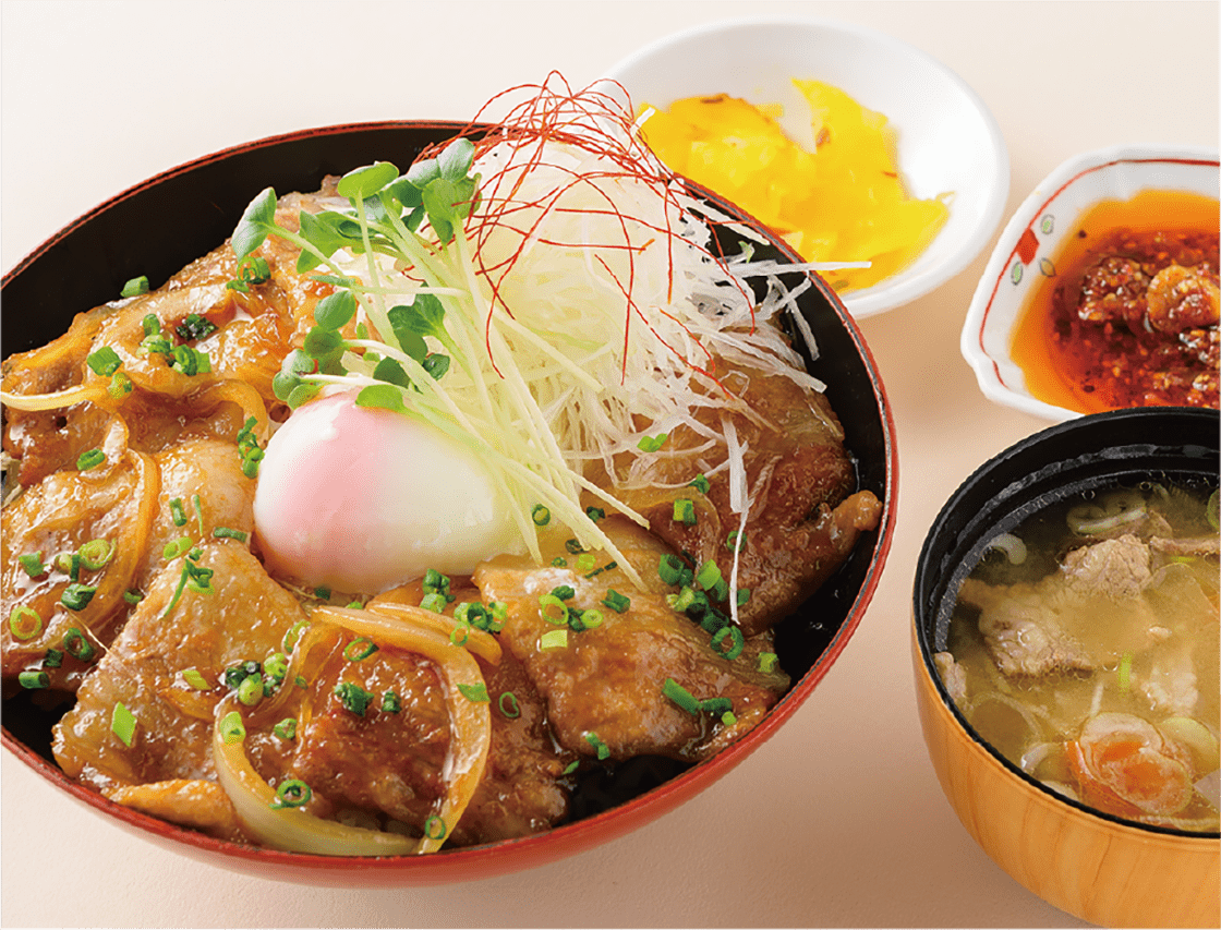 にんにくが効いた甘辛のタレで焼き上げた麓山高原豚のバラ肉にえごま入りの具沢山ラー油をかけて食べるスタミナ満点の丼ぶり。