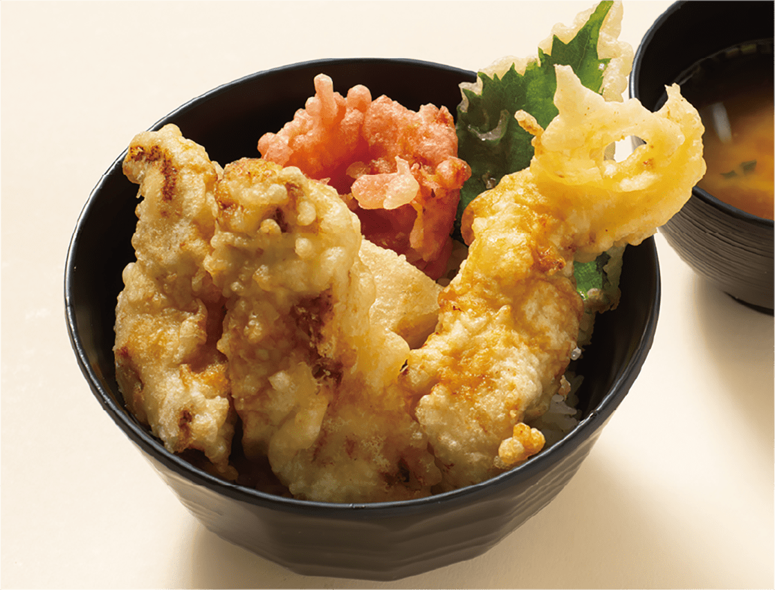 弾力のある肉質が特徴的な伊達鶏のむね肉の天ぷらと、サクッとした紅ショウガのかき揚げの取り合わせがクセになる丼です。