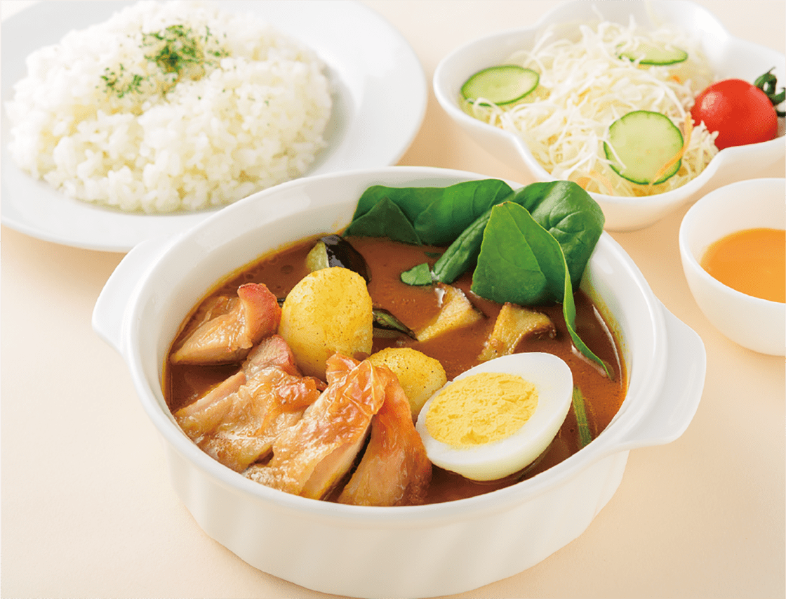 岩手のブランド鶏「菜彩鶏」のジューシーな旨味と八幡平ほうれん草の豊かな味わいのスープカレーです。