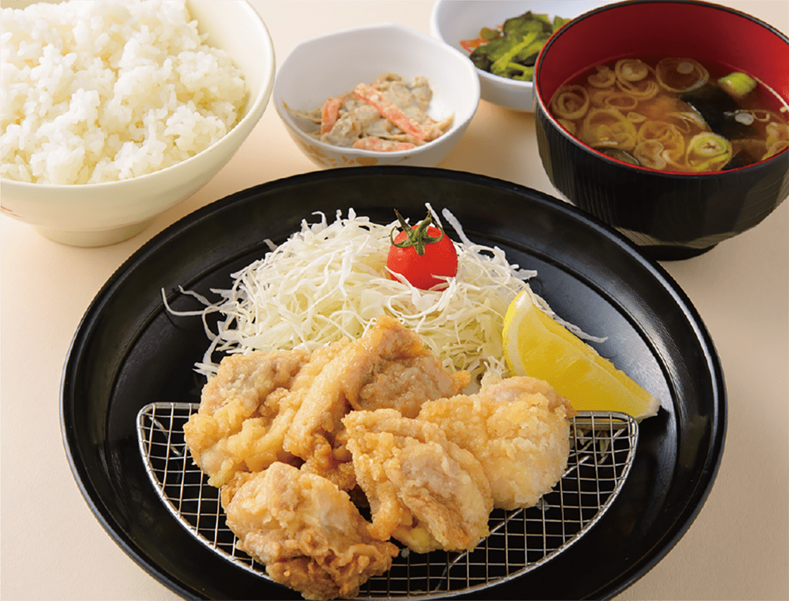 岩手県産「みちのく清流どり」のモモ肉を唐揚げにしました。ふんわりとジューシーな食感です。肉の旨味を壊さないように、あっさりと塩味で仕込んでいます。