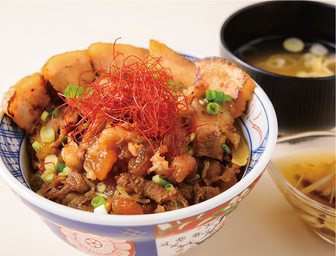 ブランド牛前沢牛のすじ肉と岩手県産豚バラ肉の角煮の柔らかなとろとろ食感をご堪能ください。別皿で提供するきのこ餡で味変もお楽しみいただけます。