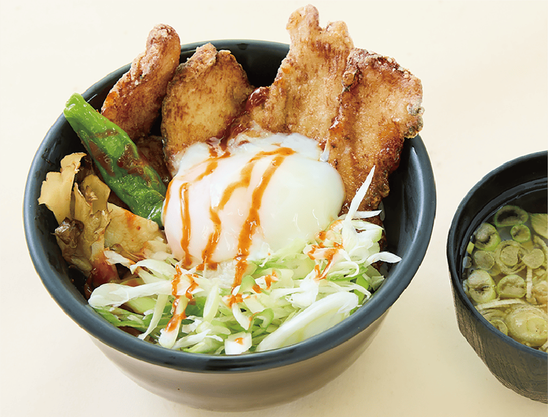 塩こうじで漬け込んだ赤城どりの竜田揚げに甘辛ダレをかけました。温玉でまろやかな味わいに。
