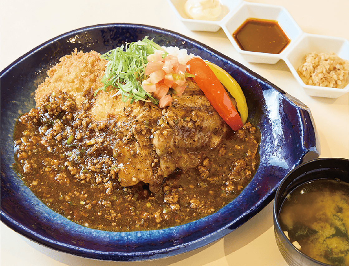 秩父名物わらじかつと炙り豚に仕立てた2種の姫豚に、特製麻婆をたっぷりと。