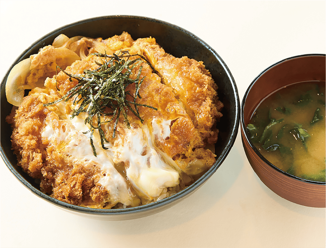 コクと甘みが特徴の地元産新鮮卵を使ったカツ丼と、地産野菜「のらぼう菜」のみそ汁。