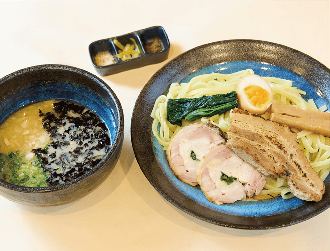 地鶏タマシャモの自家製チャーシューと、とろりと仕上げたサイボクのゴールデンポークを使用した角煮がのった旨味たっぷりのさっぱり系白湯つけめんです。