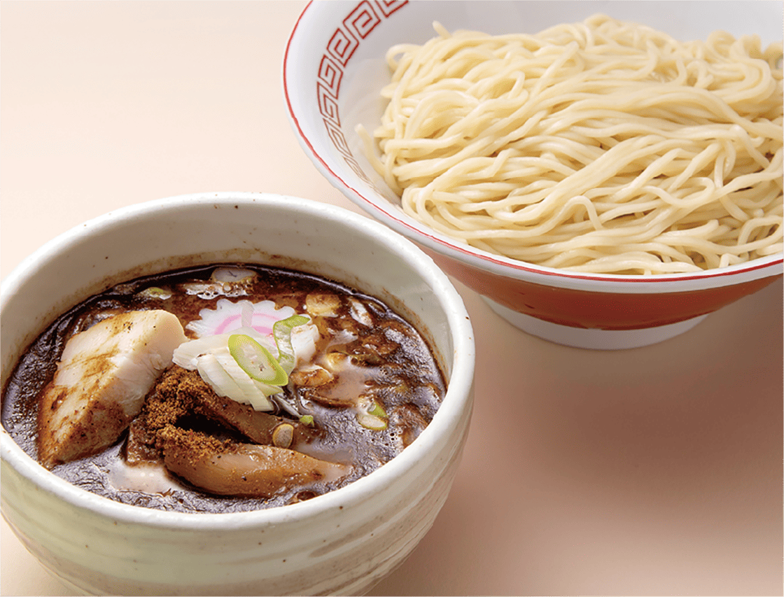 川越「頑者」の創業時の味ガンジャラーメンの細麺を使用した新感覚つけ麺。つけ汁は濃厚魚介豚骨スープをつけ麺用にアレンジ。