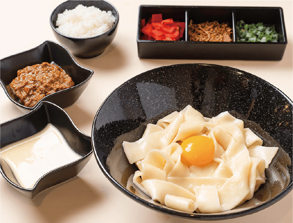 埼玉県産小麦あやひかりを使用したもちもち食感の幅広うどんを自分好みの味(釜玉風・カルボナーラソース・カレーミンチソース)で楽しむまぜうどん。最後に追い飯をまぜて〆。