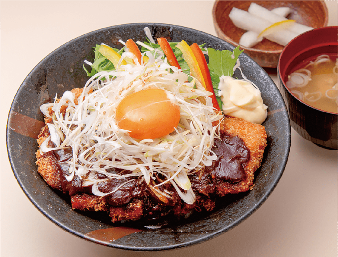 創業四百年の老舗蔵「青源」特製みそダレが那須豚カツにベストマッチ。さらに名産ネギと御養卵がしゃっきり食感とまろやかなコクをプラスします。