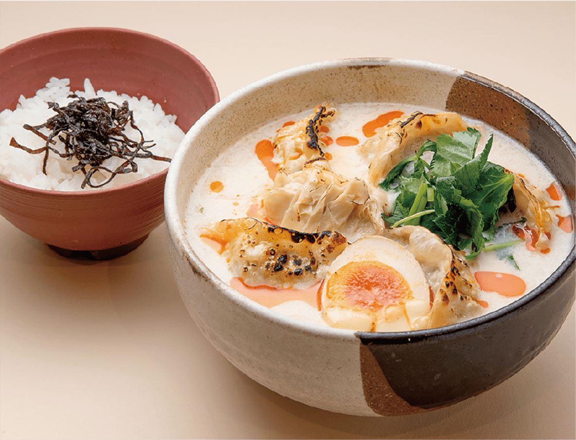餃子を揚げて湯葉をのせチーズをトッピング。小ライスは豆乳雑炊としてお召し上がりくださいませ。