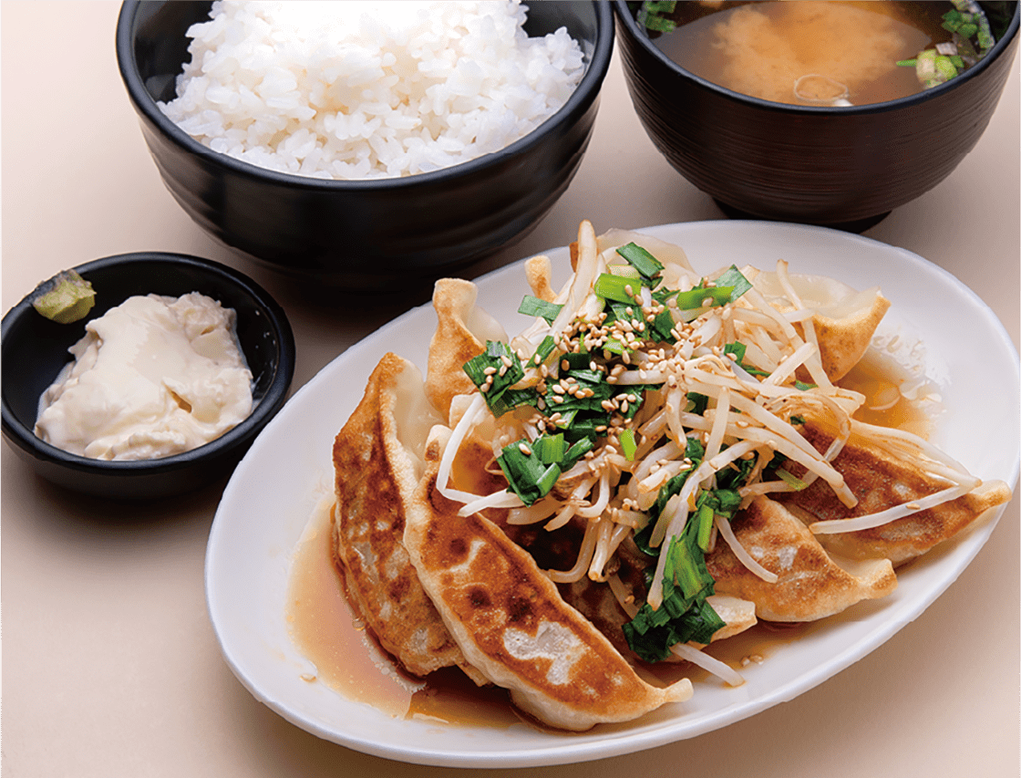 焼き餃子に栃木県産のニラを使った特製だれをかけ、日光のまろゆばをセットにした地域に富んだメニュー。