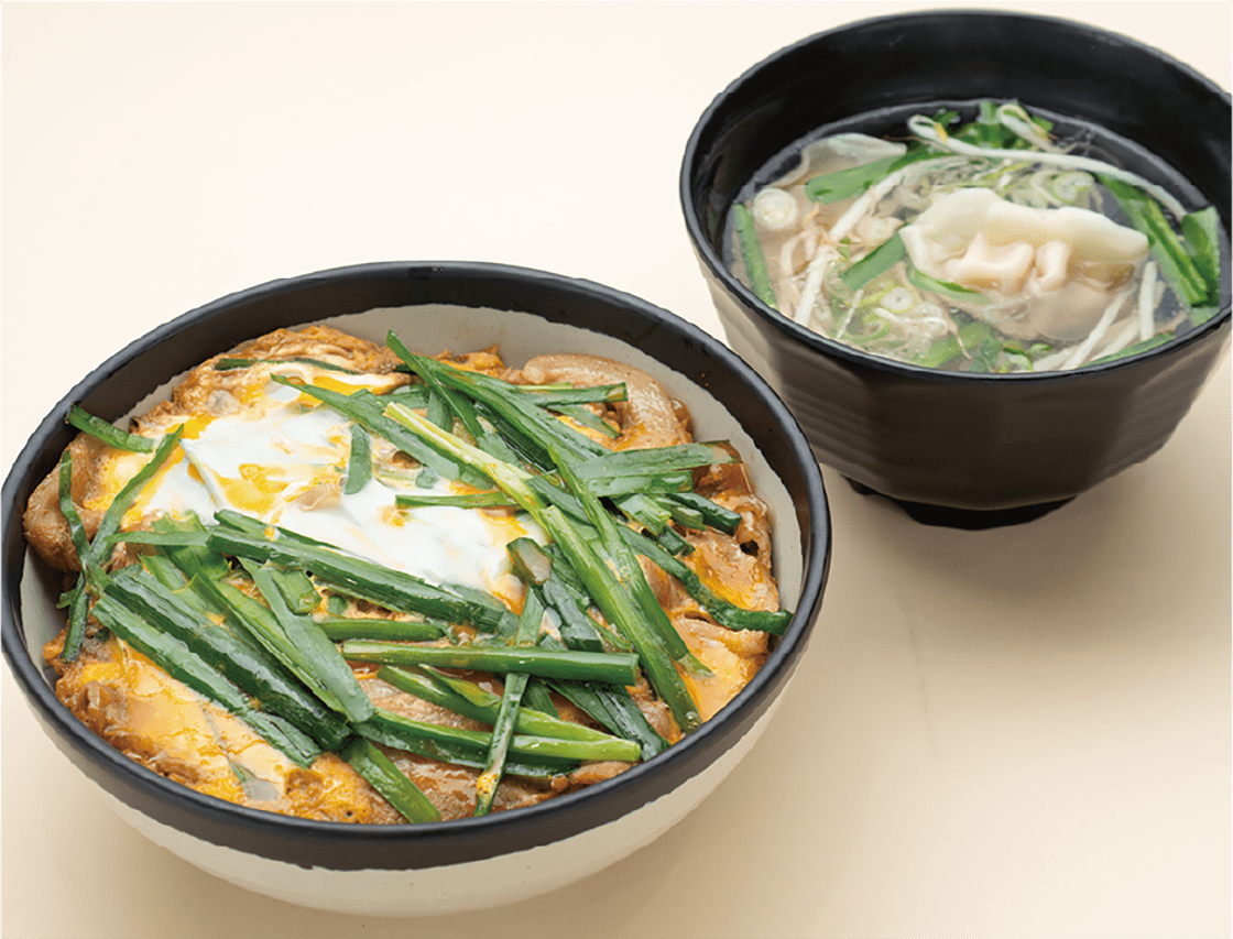 当店人気メニューである栃木県産ニラを使用した「豚ニラ玉丼」と水餃子スープをセットにしました。