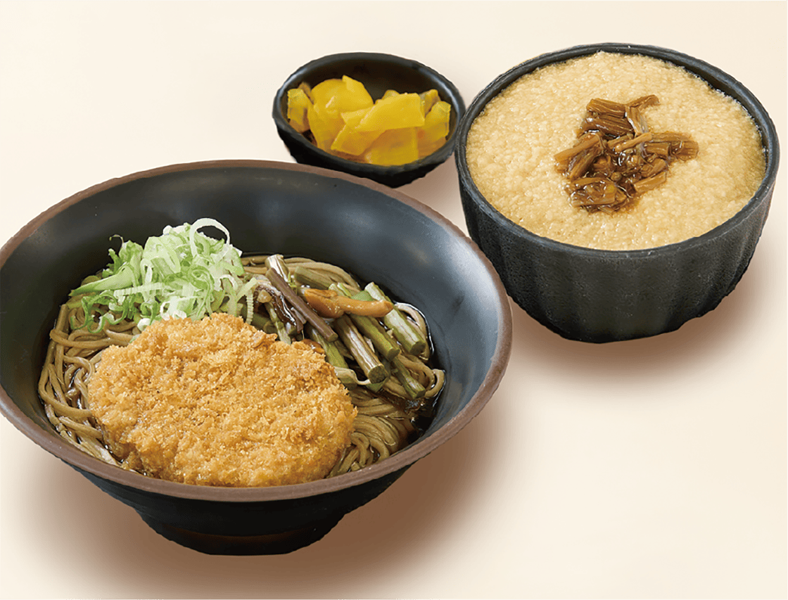 ピリッとした味わいがクセになる!わさびコロッケそばと、信州伝統野菜「ぼたんこしょう」を使ったなめ茸をトッピングしたとろろご飯のセット。