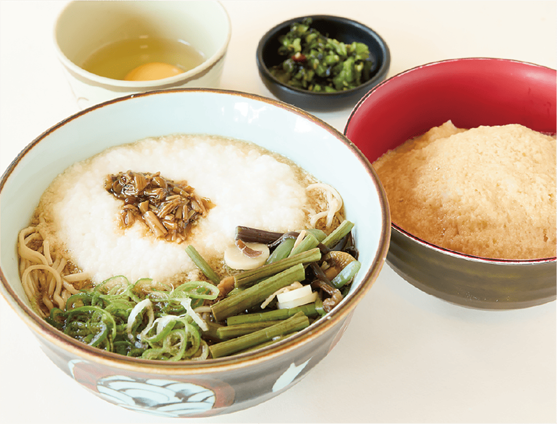 とろろたっぷりのお蕎麦に、信州伝統野菜「ぼたんこしょう」を使ったピリ辛のなめ茸をトッピング!とろろ丼もついた食べ応え抜群のセットです。