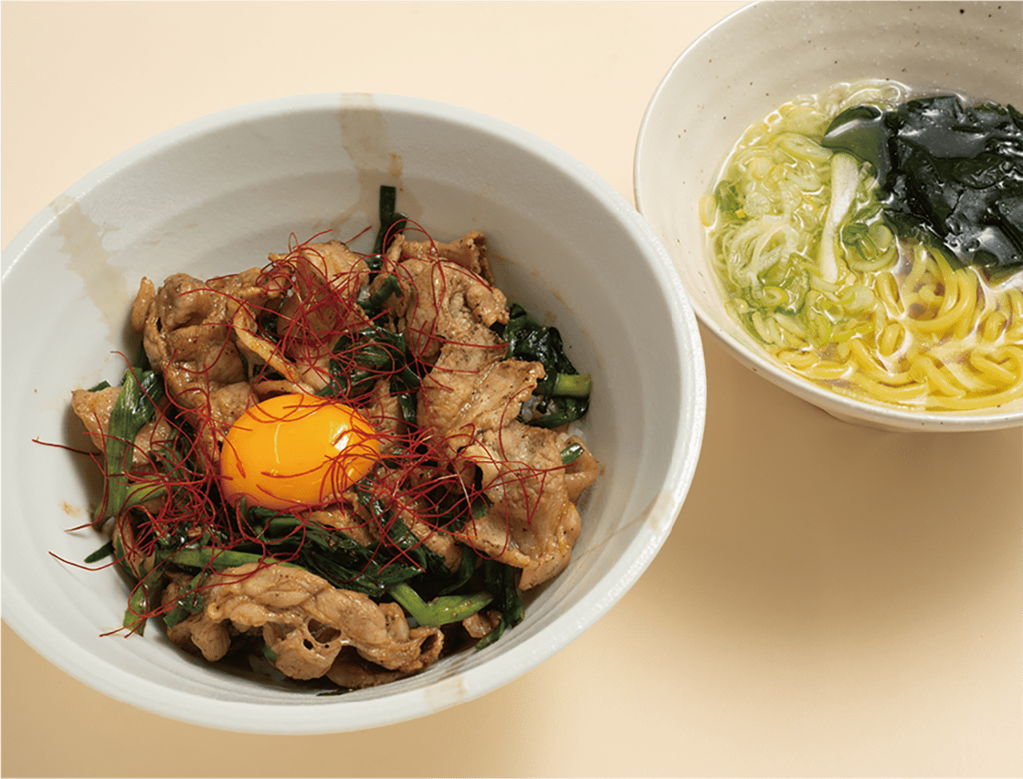 スタミナ満点!特製ピリ辛ダレが決め手の豚ニラ丼に、もちもち麺の塩ラーメン(ハーフ)を添えた満腹セット!