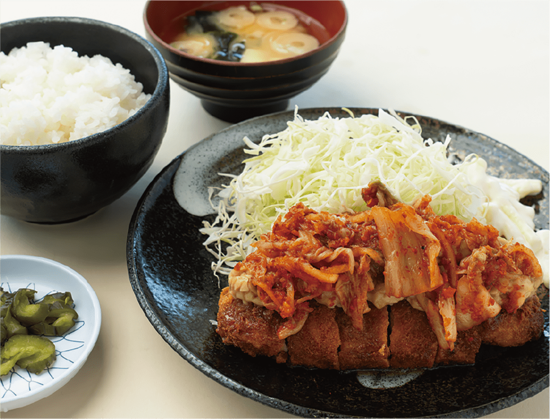 初代茨城納豆かつ定食を更に進化アレンジさせ納豆と相性抜群の水戸産のキムチをのせた2代目納豆キムチかつ定食です。