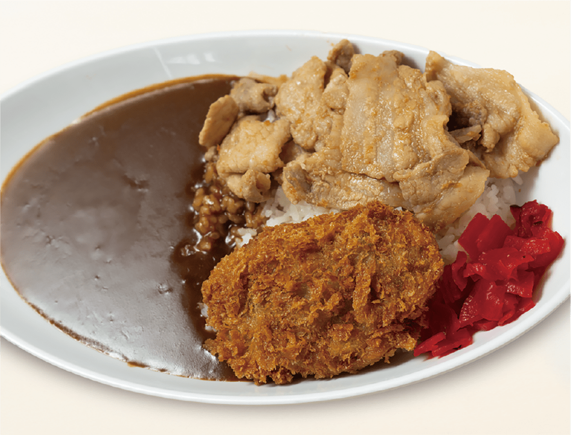 地元お肉屋さんが作った常陸牛入りメンチカツと当店人気No.1の生姜焼きをトッピングしたボリューミーなカレー。