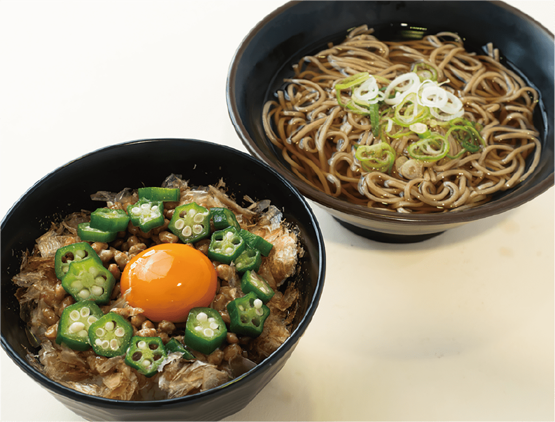 地元茨城県のだるま食品のだるま納豆を使用した、納豆ごはんとうどん・そばセット。