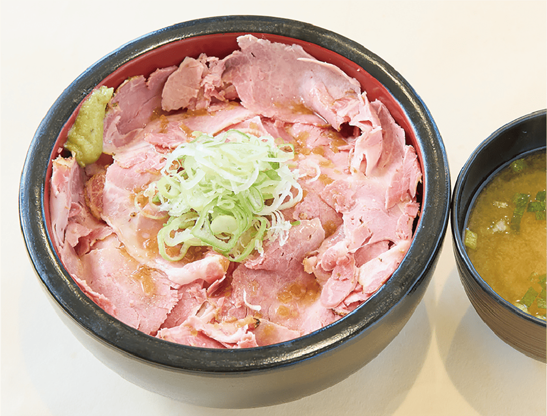 地元みなかみ町の肉屋「育風堂」が誇る豚ロースを使った、花びら盛りのローストポーク丼。さっぱり柔らかなお肉をご堪能下さい。