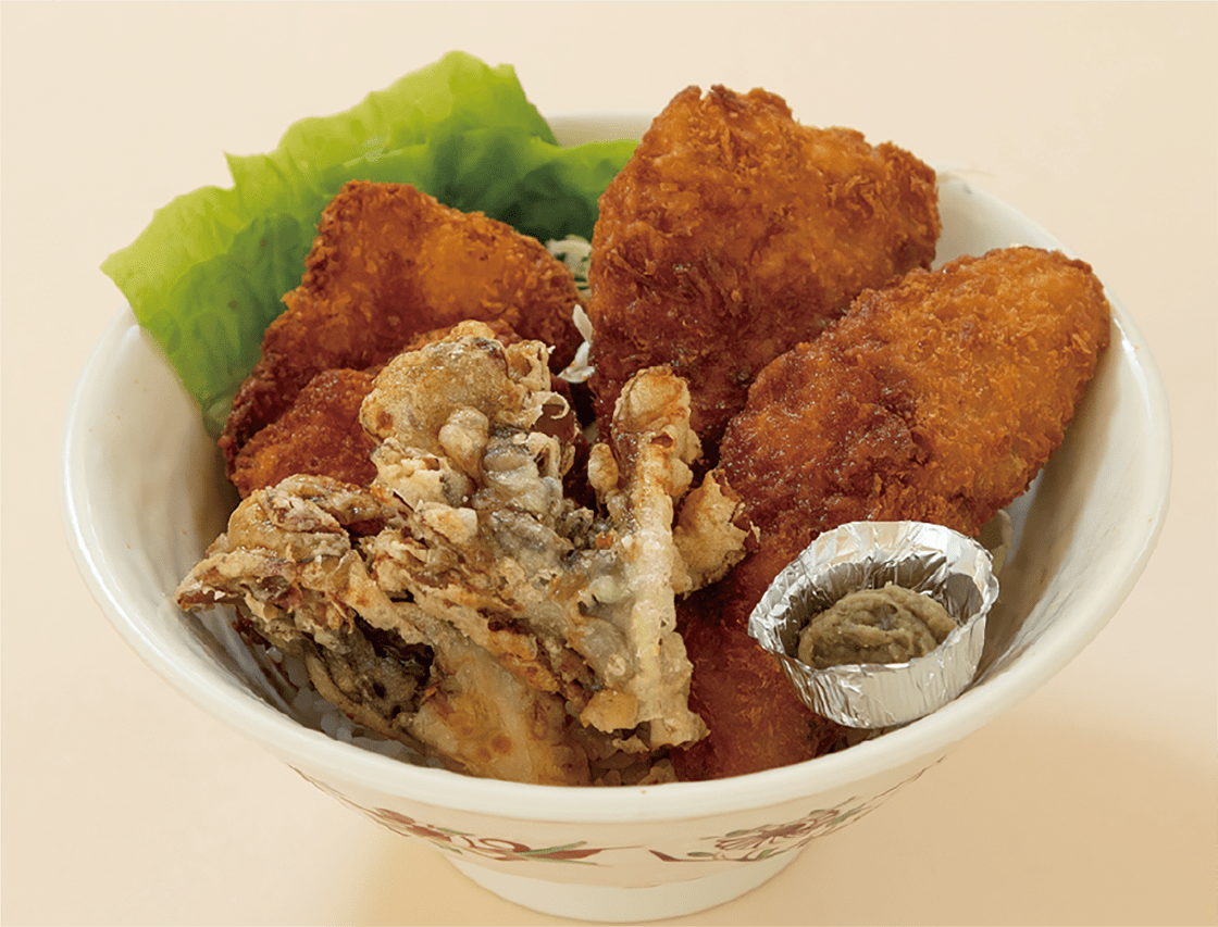 佐渡名物をイメージしたブリのカツや越の鶏チキンカツ、雪国まいたけの天ぷらも添え新潟満喫の一杯に!味変に神楽南蛮柚子胡椒をどうぞ。