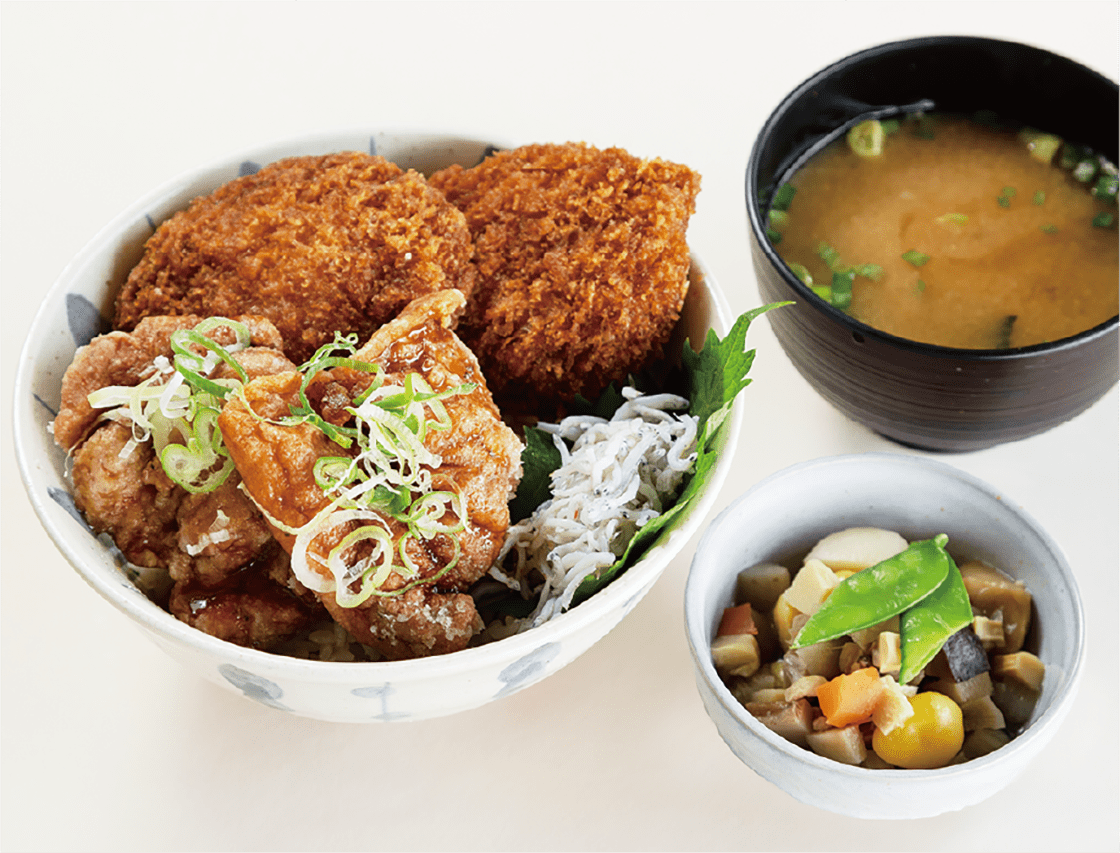 新潟のソウルフード「タレカツ」と香味ダレが食欲をそそる「油淋鶏」がどんぶりで競演!新潟県の郷土料理「のっぺい汁」も添えたまんぷくなどんぶりをぜひご賞味下さい。
