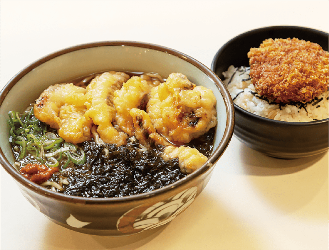上越地域のソウルフード「かけ中華」に、塩いかの天ぷらをトッピング。新潟のご当地メニュー「タレカツ丼」とご一緒にどうぞ。