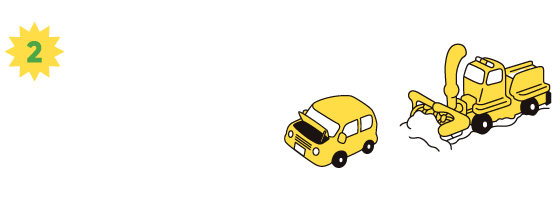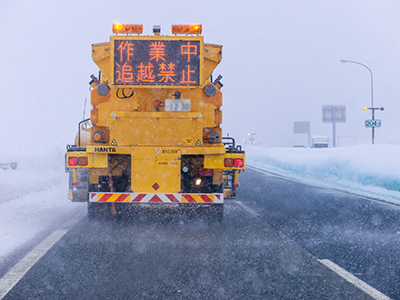 除雪車が巻き上げた雪や凍結防止剤が飛んできたり、追い越した先の道路状況が変化するため、追い越し・追い抜きをせず、車間距離を十分に取って作業車の後を走行してください。
