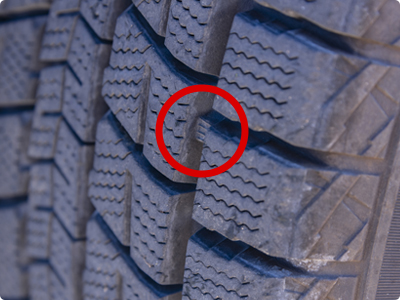 乗車前に、溝の深さがブロックの間にギザギザが刻まれた突起まで近づいていないか、また空気圧が大丈夫か、傷がないかをチェックしましょう。