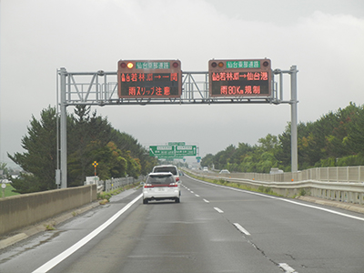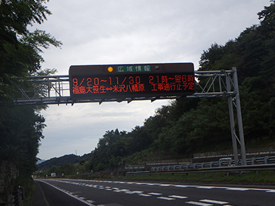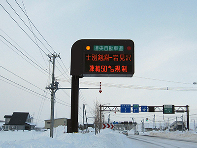 情報板は現時点の道路・交通情報を的確にお知らせしています。降雪や吹雪等により高速道路が通行止めとなった場合には、一般道へ迂回してください。