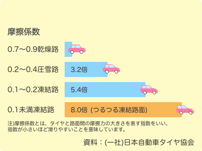 乾燥した路面と圧雪路面・凍結路面で車の滑りやすさを比べた場合、乾燥した路面に比べ圧雪路面では3.2倍、凍結路面では5.4倍、つるつるの凍結路面では8.0倍も滑りやすいと言われています。