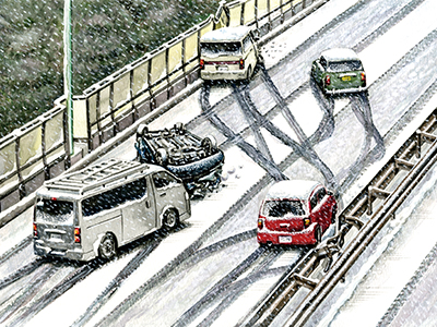 積雪・凍結した冬道で通常感覚の運転は禁物。頭の中も冬道モードに切り替えてください。積雪路や凍結路での急なハンドル・アクセル・ブレーキの操作は、スピンなどを引き起こし大変危険です。