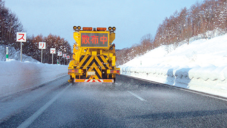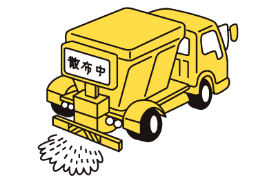 道路の凍結を防ぐために凍結防止剤を散布します。時速50km前後で作業を行うため、他の車両の速度低下につながることがあります。