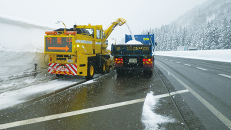 高速道路の路肩にたまった雪を、本線から取り除きます。ロータリー除雪車のほか、場所によってはダンプトラックを使用して排雪します。