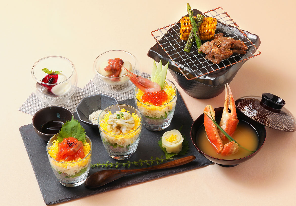 郷土料理「鮭ルイベ」、「いかそーめん」に刻んだ「がごめ昆布」、甘えびといくらをのせた3種のご飯物にカニ汁と、北海道の海の幸を満喫。ジンギスカンやトウモロコシも道産子が好きなバーベキュー気分でどうぞ。