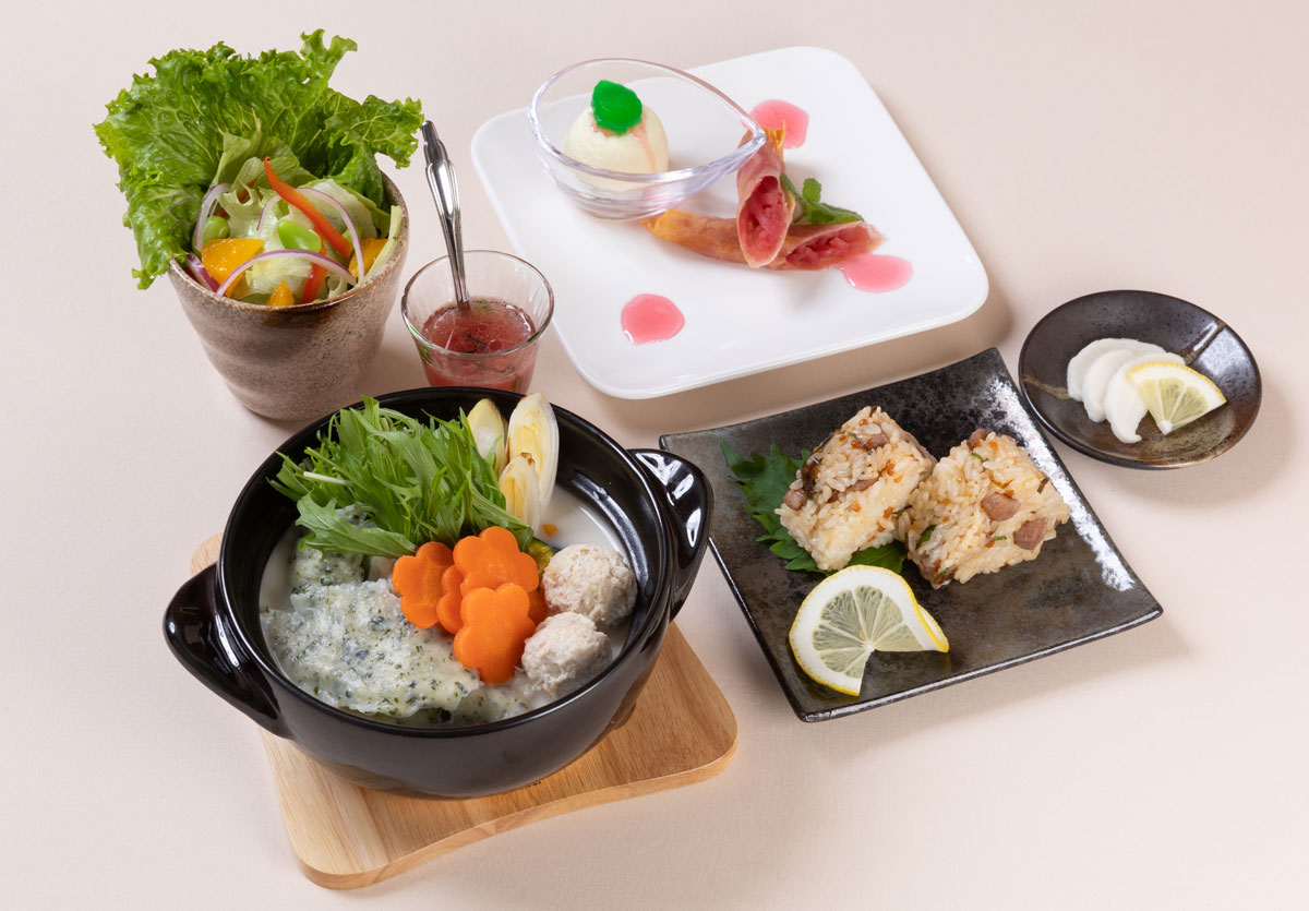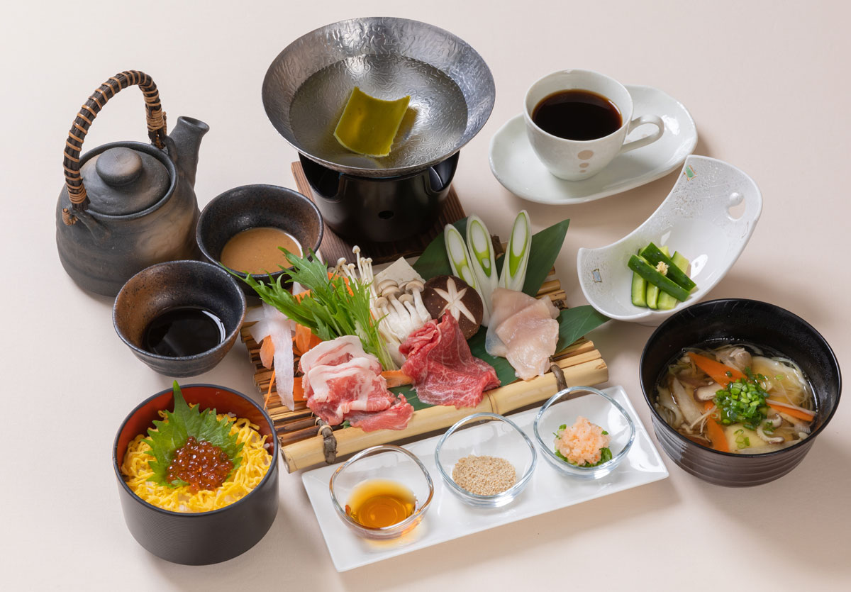 メインのしゃぶしゃぶ肉は岩手を代表する「いわて牛」「南部高原豚」「菜彩鶏」の3種を贅沢に使用。やさしく心あたたまる「自家製ひっつみ汁」をセットにしボリューム、価格、懐かしさすべてに納得のおすすめ膳です。