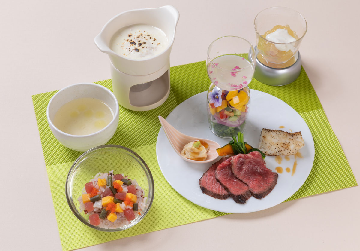 岩手の海、山、陸の美味しい食材を手軽に味わってもらえるように海は鱈、山は蕨、そして地元ブランド牛「前沢牛」を選びました。また、料理全体が明るく楽しい印象になるように器や色合いも考えました。