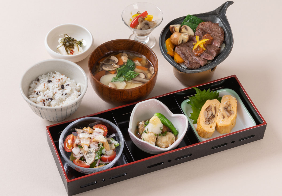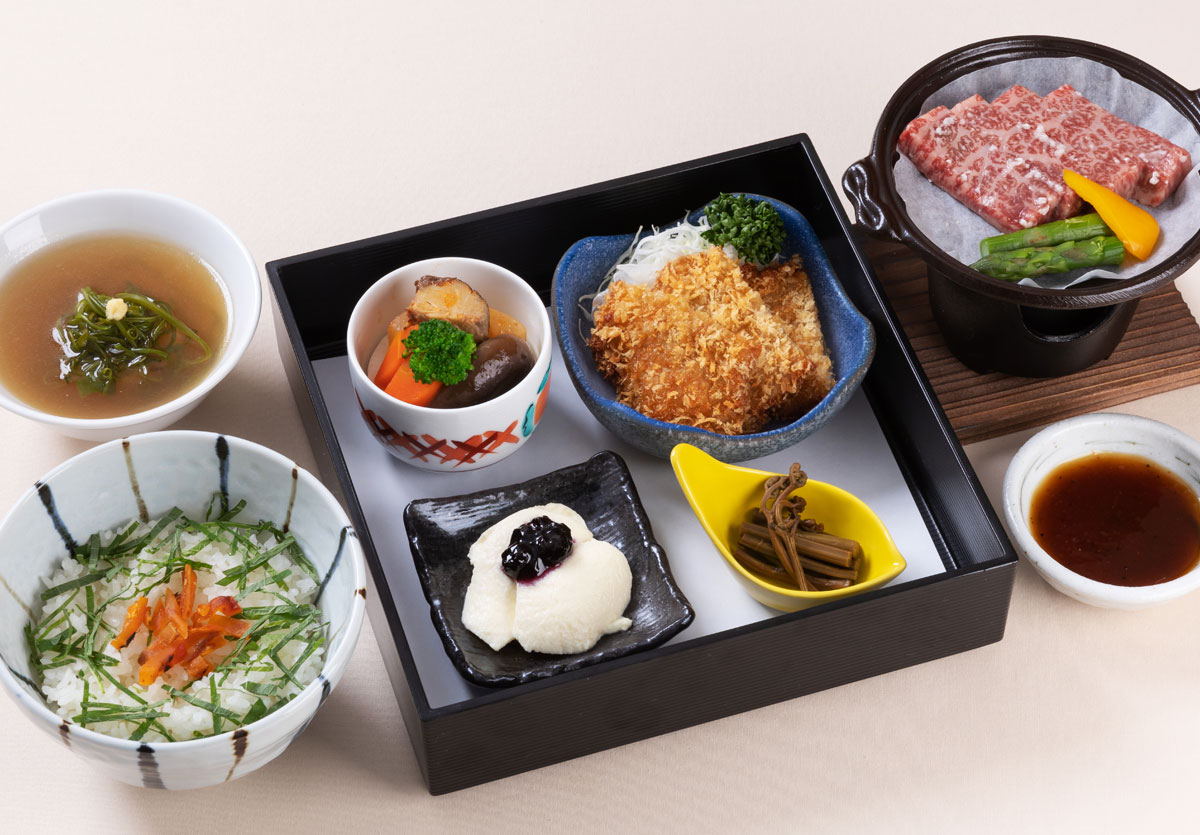 岩手山の伏流水と自然の恩恵を受け丁寧に育まれた「雫石牛」の陶板焼をメインに、花巻市産「白金豚」を使用した味噌が香ばしい味噌漬フライ、地元野菜の一品など食の宝庫岩手の魅力が詰まったお膳をどうぞ。