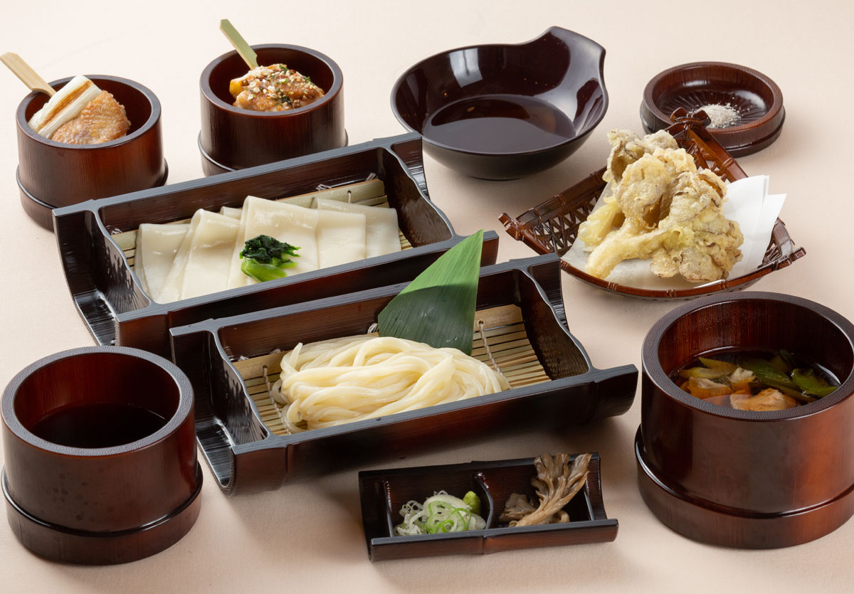 群馬県には日本三大うどんと言われる「水沢うどん」だけでなく、「ひもかわ」という歴史ある麺があります。その両方を一緒に楽しめる一品を、冷たいつけ汁と、温かい肉汁の2種類でお楽しみいただけます。