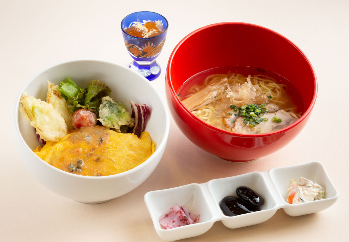 群馬県産の希少な「上州地鶏」。チャーシューや県産の鶏卵で包み込んだオムライスの具材に使用。地鶏ならではの肉質の弾力と旨みをお楽しみください。