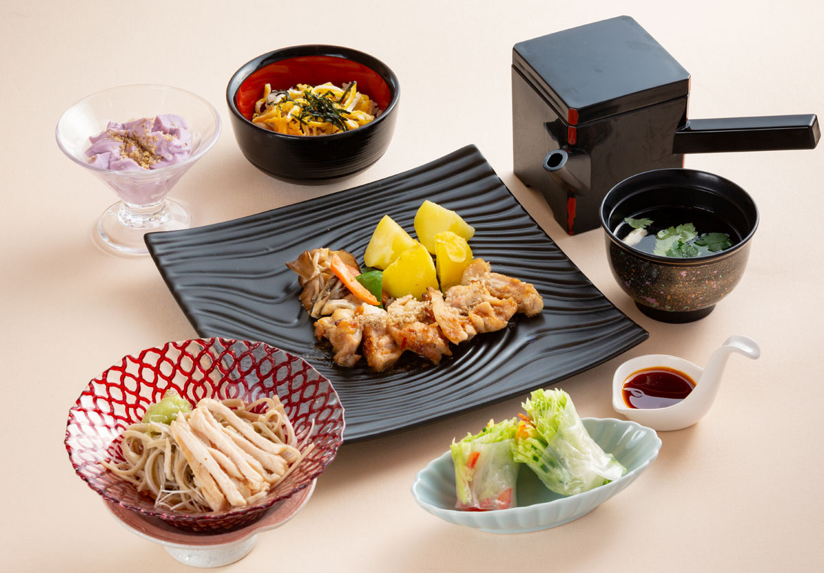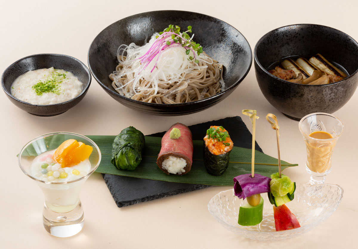 通常現地でしか味わえない「大久保西の茶屋」の戸隠蕎麦は、長野県産銘柄鶏「信州ハーブ鶏」を用いて鶏南蛮仕立てに。「野沢菜」「信州蓼科牛」「信州サーモン」3種の寿司とともに信州の魅力をアピールしました。