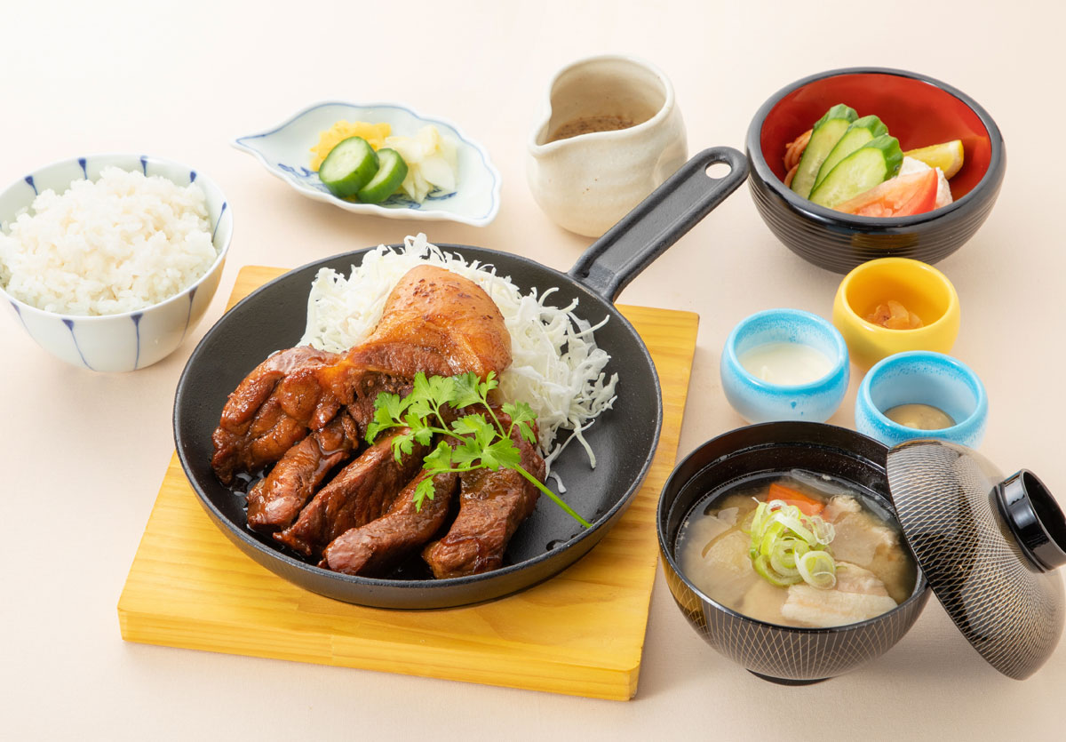 贅沢に緑茶と乳酸発酵させた液体飼料で育てた「千葉県産緑茶豚」の肩ロースを使ったトンテキに、レモンマヨとガーリックチップや和からし・ピーナッツドレッシングを添え、食べ方のバリエーションも豊富にしました!