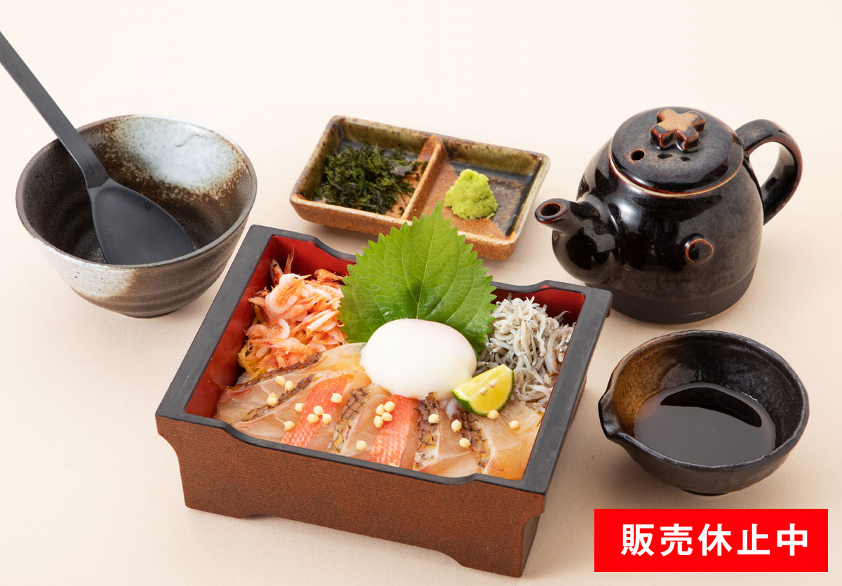千葉県銚子で水揚げされた金目鯛を「木更津庵」料理長秘伝の漬けダレに潜らせ、鯛と金目を扇状に盛りつけました。スダチをしぼりそのまま、秘伝のタレと温泉卵、鯛茶漬けと3種の美味しさをお楽しみください。