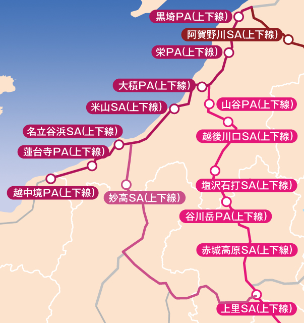 黒埼PA(上下線)・栄PA(上下線)・大積PA(上下線)・米山SA(上下線)・名立谷浜SA(上下線)・蓮台寺PA(上下線)・越中境PA(上下線)