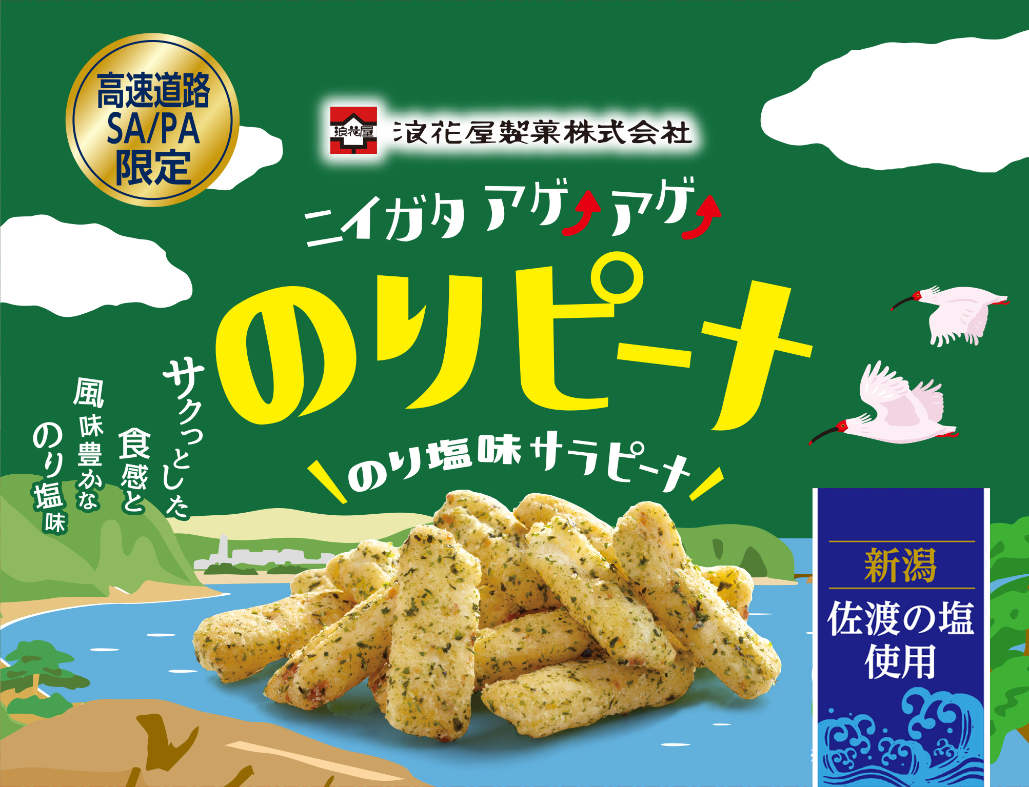 『浪花屋製菓』とのコラボレーションにより、『サラピーナ』の高速道路限定商品『ニイガタアゲアゲ のりピーナ(のり塩味サラピーナ)』が新登場。風味豊かな青のりと、昔から塩の製造が盛んな佐渡島で丁寧に作られたミネラル豊富な塩で味付けしました。ご家族やご友人へのお土産にはもちろん、小腹が空いたときのドライブのお供にもぴったりな一品です。