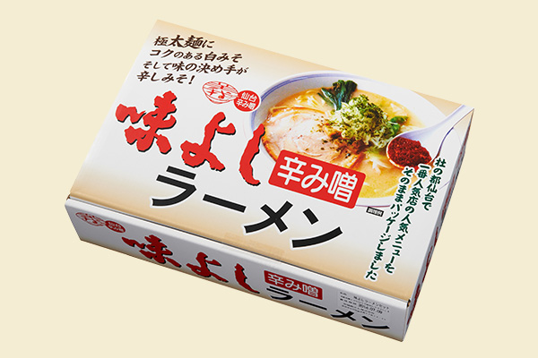 杜の都仙台で人気のラーメン店「味よし」。その「味よし」を代表する辛み噌ラーメンがご家庭でも味わえる。極太麺にコクのある白みそ。そして仙台の辛し味噌が味の決め手だ!