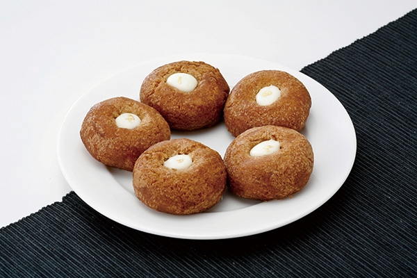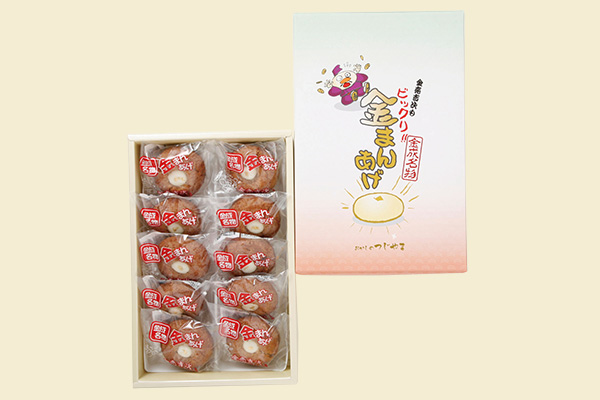 源義経を藤原秀衡のもとに案内した、金売吉次にちなんだ洋風の揚げまんじゅう。生地にこしあんを包んで揚げ、真中にのせた金粉がポイントに。縁起のいいお菓子です。